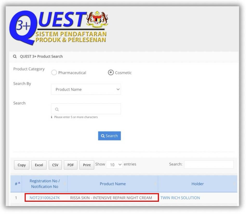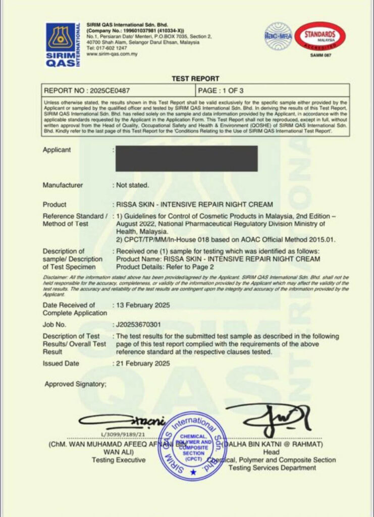 Rissa Skin Intensive Repair Night Cream Lulus Ujian SIRIM & Kementerian Kesihatan Malaysia (KKM).